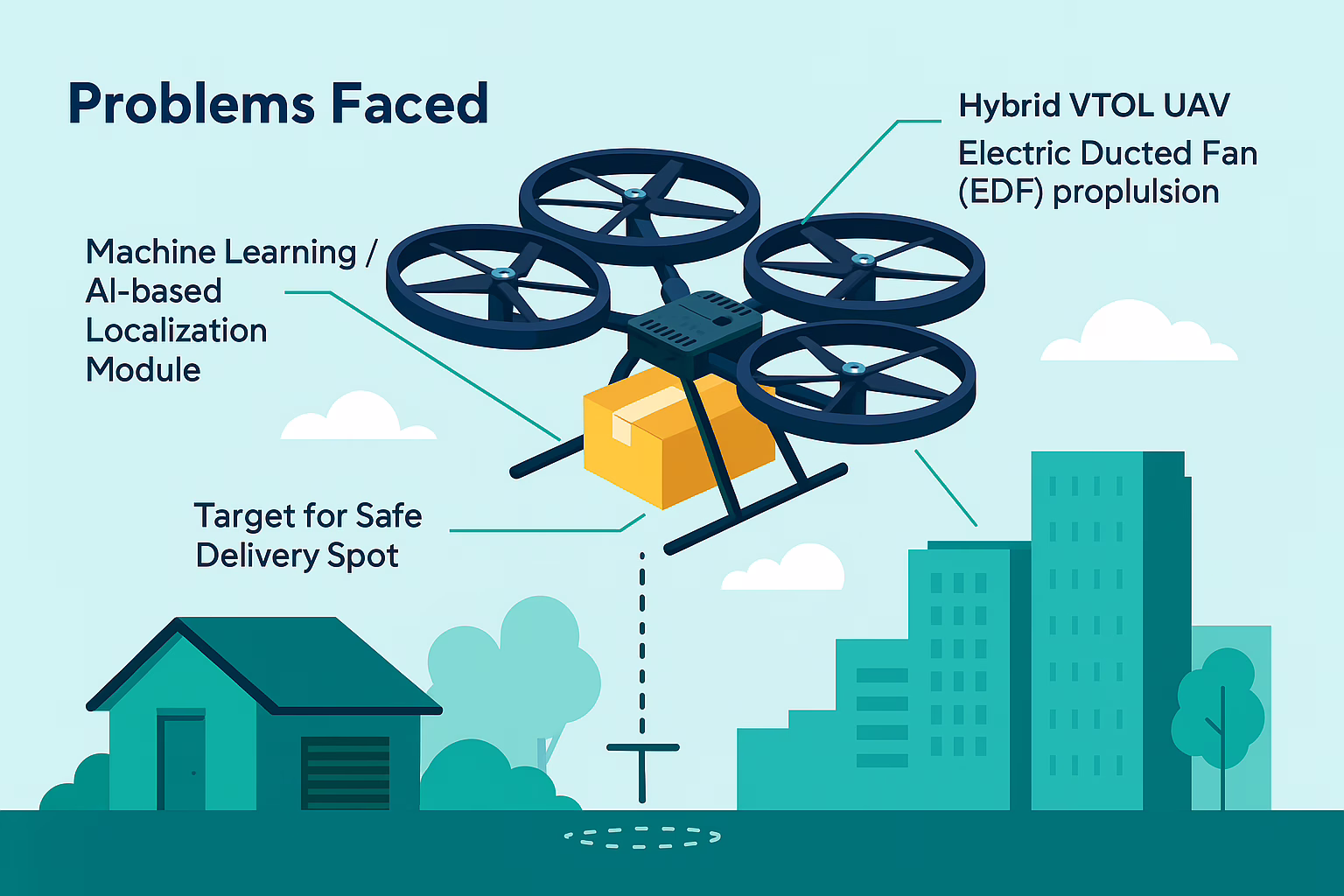 This project addresses these challenges by developing a VTOL delivery system equipped with Electric Ducted Fan (EDF) propulsion and an AI-based localization module capable of identifying safe delivery spots and assessing environmental risks in real time.